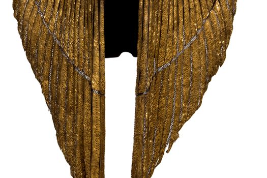 Capa a fost astfel croită pentru a semăna cu aripile unui vultur şi conţine fâşii din piele aurie şi câteva mii de mărgele.