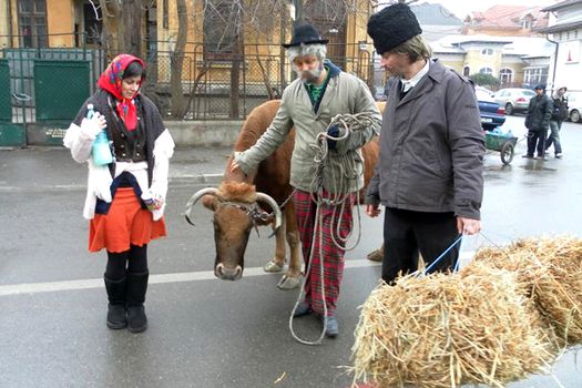 Cătălin Măruţă şi-a făcut apariţia deghizat în moşneag, cu o văcuţă cât se poate de reală, vineri dimineaţă, în centrul Bucureştiului.