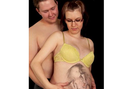 Viitoarea mamă care şi-a desenat copilul pe care îl aştepta pe burtă este surprinsă în imagine alături de partenerul său, care îi mângâie cu tandreţe pântecul.