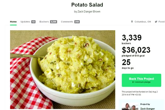 Inspirat de succesul atâtor proiecte (până acum, 44% dintre strângerile de fonduri au fost finalizate cu succes), americanul Zack Danger Brown a cerut ajutorul utilizatorilor pentru o cauză ieşită din comun. Brown a cerut bani pentru a cumpăra ingredientele necesare unei salate de cartofi. „Cineva m-a întrebat dacă am făcut vreodată salată de cartofi şi nu i-am putut răspunde afirmativ. Aşa că mi-am îndreptat atenţia spre Kickstarter ca să schimb acest lucru”, spune el pentru Buzzfeed. Americanul a stabilit o ţintă de doar zece dolari şi a specificat că nu ştie exact ce fel de salată vrea să facă, urmând să ia o decizie pe parcurs.