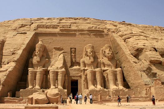 Templul de la Abu Simbel este păzit de patru statui colosale, de 20 de metri înălţime, care îl infăţişează pe Ramses al II-lea.