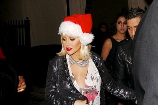 Christina Aguilera a fost suprinsă îmbrăcată doar cu un tricou, ciorapi din plasă şi având pe cap o căciuliţă de crăciuniţă, scrie Daily Mail.