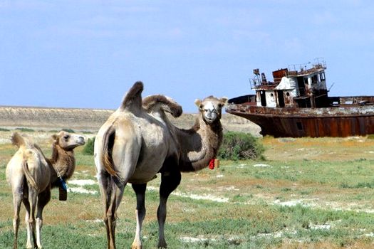 Cămilele se plimbă printre ruinele navelor abandonate în zona Lacului Aral, cunoscut şi sub numele de Marea Aral, informează Daily Mail.
