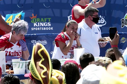Nici femeile nu se lasă mai prejos. Michelle Lesco se află pe locul 9 în clasamentul generat, însă, în acest an a ieşit prima pe listă după ce a înfulecat 30 şi 3/4 hotdogi.