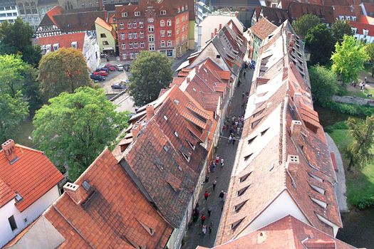 La fel ca Vechiul Pod al Londrei, din Marea Britanie, demolat în 1831, sau Ponte Vechhio, din Italia, Krämerbrücke (n.r. Podul Negustorilor, Podul Băcanilor) este cunoscut pentru clădirile pe care le găzduieşte. Construit, iniţial, din lemn şi menţionat pentru prima dată în 1117, acesta traversează Breitstrom, un braţ al râului Gera. După incendii repetate, administraţia locală a hotărât să înlocuiască vechiul pod cu unul din piatră, care a fost finalizat în 1325. Negustorii s-au instalat în clădirile de pe ambele părţi, fapt care a dus la denumirea folosită şi astăzi.