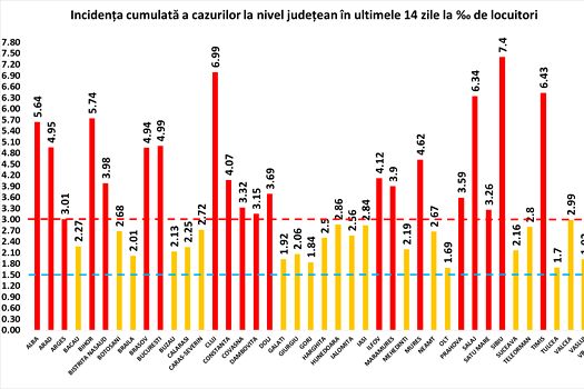 Coeficientul infectărilor cumulate la 14 zile, raportate la 1.000 de locuitori este calculat de către Direcţiile de Sănătate Publică, la nivelul Municipiului Bucureşti şi al judeţelor. Mai jos aveţi graficul realizat în baza raportărilor primite de CNCCI de la Direcţiile de Sănătate Publică: