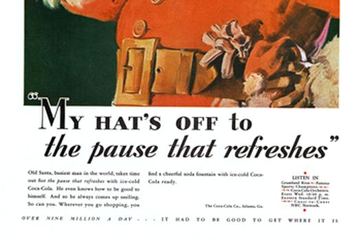 Mesajul primului desen cu Moş Crăciun a fost unul dintr-o temă din campaniile anterioare: „pauza care te împrospătează”. Imaginea a apărut în The Saturday Evening Post, Ladies Home Journal, The New Yorker şi National Geographic.