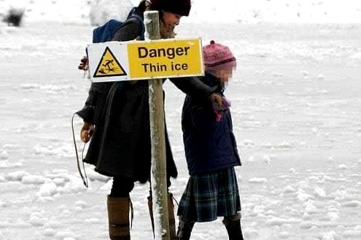 O mamă păşeşte, împreună cu copilul său, pe gheaţă subţire, în poză putând fi observată avertizarea de pericol.