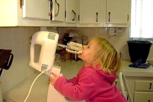 O altă imagine cu un copil în pericol şochează. O fetiţă mănâncă de pe un mixer în priză, întrebarea fiind unde sunt părinţii care ar trebui să o supravegheze.