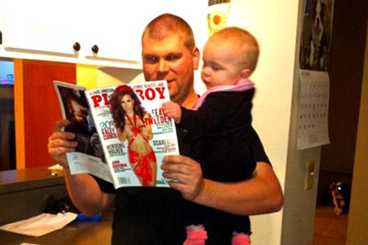 Un părinte citeşte revista Playboy în timp ce îşi ţine copilul în braţe, micuţul fiind şi el captivat, după cum se vede în poză, de fetele dezbrăcate.