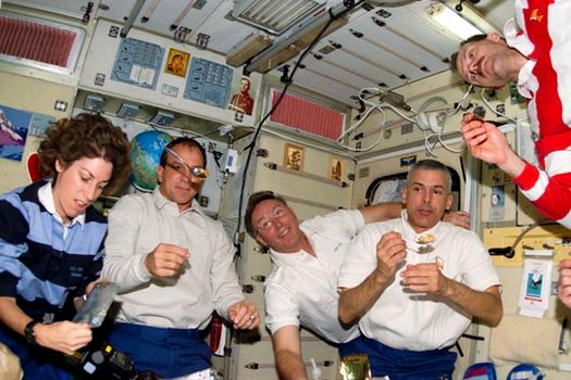 Pe staţia ISS nu există frigidere, astfel că mâncarea trebuie stocată corespunzător pentru a se evita degradarea acesteia. Alimentele sunt uscate prin îngheţare, apoi rehidratate în spaţiu.