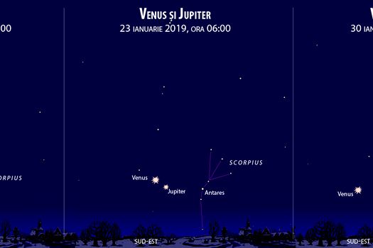La începutul lunii ianuarie, Jupiter a răsărit mai târziu decât Venus. Pe măsură ce au trecut zilele, planeta Venus s-a deplasat printre stele astfel că, în perioada 21 – 25 ianuarie poate fi văzută apropiindu-se de Jupiter. Cele două corpuri cereşti strălucitoare pot fi văzute una lângă alta, într-una dintre cele mai frumoase apropieri planetare ale anului.