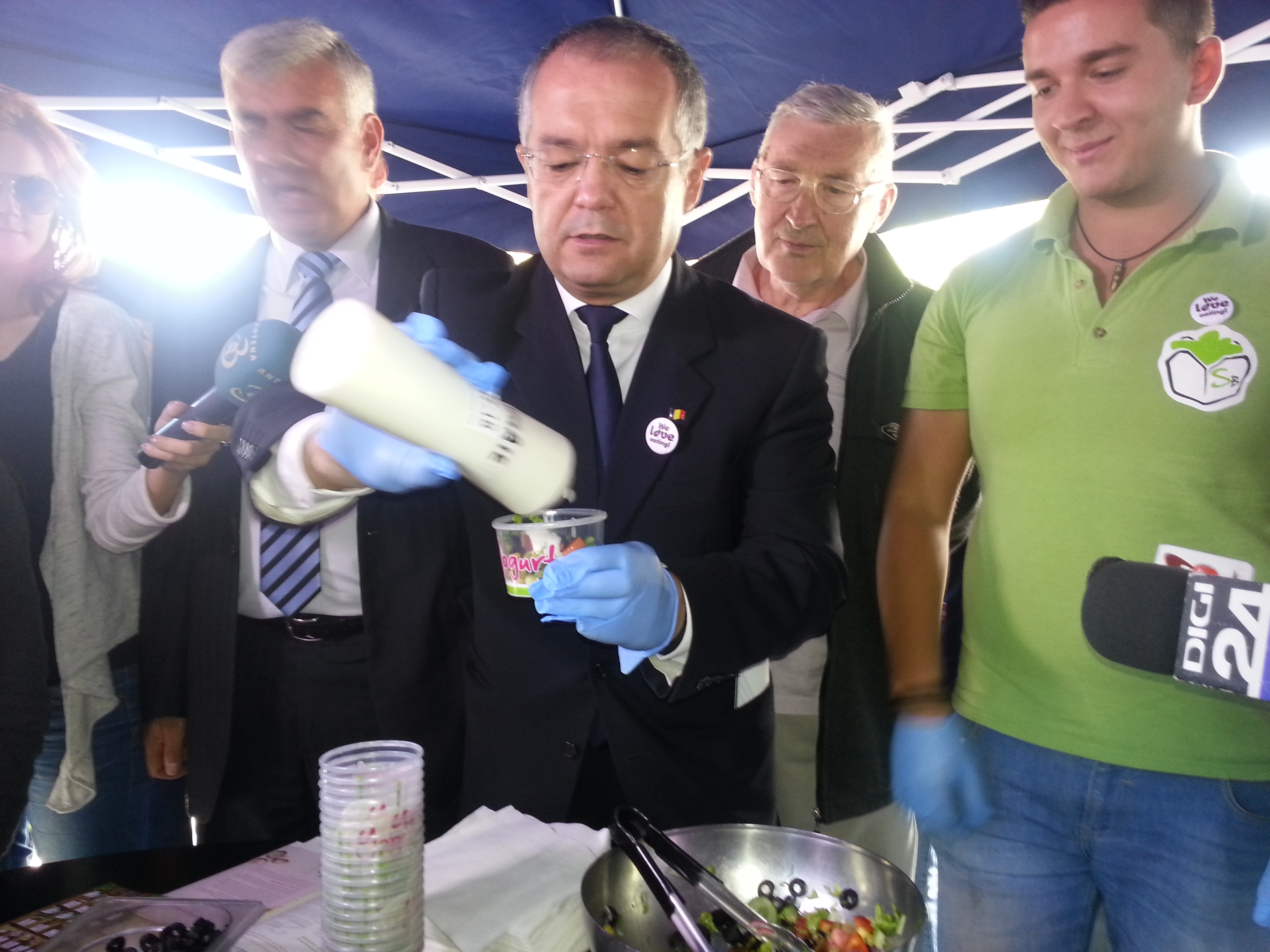 Îmbrăcat în costum, dar fără a avea un şorţ, Emil Boc s-a străduit să îşi pună o pereche de mănuşi de cauciuc albastre, însă acestea s-au rupt, ceea ce nu l-a împiedicat însă pe primar să pregătească salate din ingrediente gata tăiate şi aşezate pe farfurii.