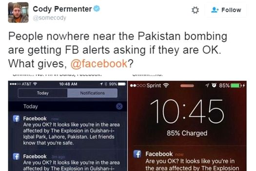 Cu toate acestea, sistemul celor de la Facebook a dar erori şi utilizatori care se aflau la mii de kilometri distanţă de Pakistan au primit notificare din partea companiei şi au fost rugaţi să spună dacă sunt bine.