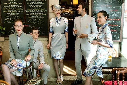 Uniformele au imprimeuri inspirate din imaginarul culturii tradiţionale chinezeşti, cu modele de nori, valuri şi inclusiv cu cel al păsării mitice „roc”. Jachetele şi hainele pe care stewardesele le vor purta peste rochii sunt echipate cu gulerul tipic mandarin, şi sunt cambrate pe talie.