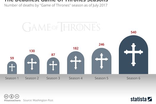 Potrivit unei statistici, cu excepţia sezonului 3, numărul morţilor a urmat o linie ascendentă, ajungând până la 540 în sezonul 6.