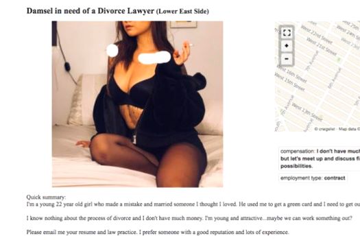 În anunţ, tânăra domnişoară făcea aluzie la faptul că ar putea răsplăti munca avocatului prin servicii sexuale, dacă acesta o va ajuta să finalizeze divorţul de actualul ei soţ.