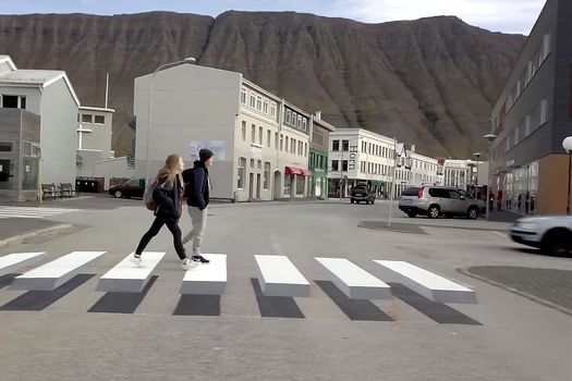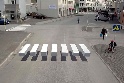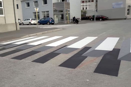 Siguranţa rutieră a primit o nouă dimensiune într-un oraş din Islanda deoarece marcajele rutiere de la trecerea de pietoni sunt realizate ca iluzii optice.