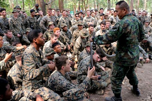 Un grup de soldaţi ai Marinei SUA au luat parte la un exerciţiu aparte, în jungla din Thailanda. Au mâncat scorpioni nepreparaţi şi au băut sânge de cobră, nu pentru că cineva a uitat să aducă mâncare, ci pentru a simula cazul în care ar rămâne izolaţi în sălbăticie.