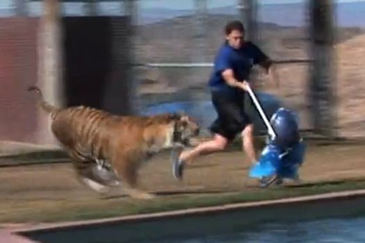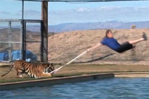 Unul dintre îngrijitorii tigrilor de la acest parc a reuşit să le dea vizitatorilor mari emoţii prin intermediul gestului său, uimind asistenţa. Jeff Harwell, în vârstă de 30 de ani, a plonjat în piscina aflată în interiorul cuştii tigrilor de la această grădină zoologică, urmat aproape pe urmele sale de către un tigru imens.