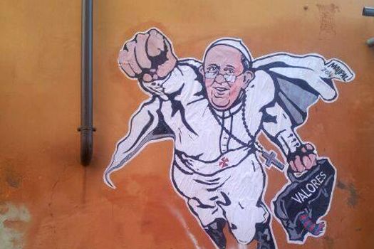 Imaginea prezintă un papă în zbor, îmbrăcat în alb, dar în celebra postură a lui Superman, cu pumnul înainte, ţinând în cealaltă mână o servietă pe care scrie în spaniolă „Valores” (valori, în sensul de valori etice).