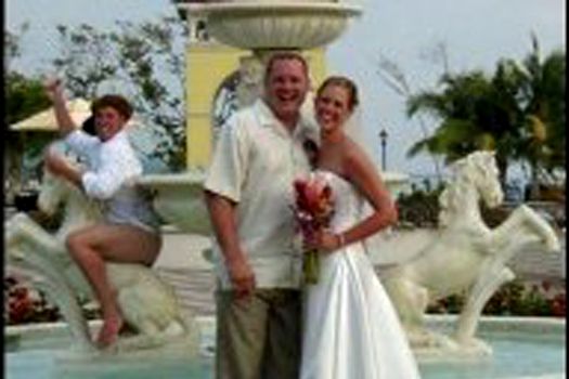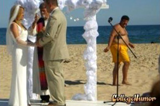 În timp ce doi miri se căsătoreau pe plajă, un bărbat îmbrăcat într-un şort galben apare în cadrul unei fotografii, informează huffingtonpost.com.