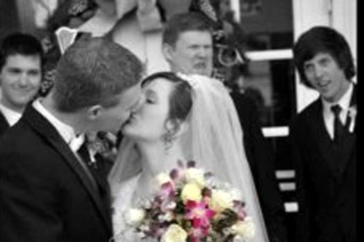 Într-o altă poză, un nuntaş face o figură foarte amuzantă, în timp ce mirii se sărută pasional.