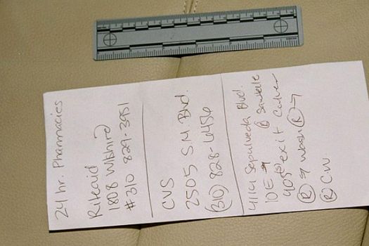 Într-o altă fotografie a poliţiei, care pare să fie făcută într-o maşină, se vede o listă cu farmacii din apropiere deschise non-stop, alături de numerele de telefon ale acestora.