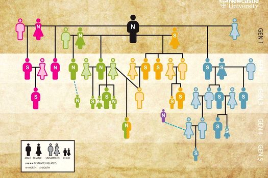 Mormântul neolitic, sau „cairn”, de la Hazleton North în Gloucestershire are două camere în formă de L: una orientată spre nord şi cealaltă spre sud. Profesorul David Reich, de la Harvard Medical School din Boston, cel ce a şi condus cercetarea ADN-ului, a explicat pentru BBC: „două dintre femei, împreună cu copiii lor de până la a cincea generaţie, se găsesc în camera de sud; apoi, celelalte două femei şi copiii lor sunt în principal în camera de nord – deşi unele dintre ele trec în camera de sud ceva mai târziu în timpul vieţii’’.