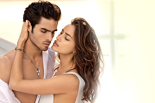 Într-un decor luminos şi plin de senzualitate, Irina Shayk îşi etalează bijuteriile în culori calde (roz, ablastru deschis, mov).