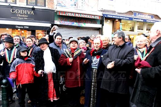 Deja îmbrăcat în costum de căluşar şi cu tricolorul legat la baza statuii, Manneken -Pis, ca de altfel întregul cortegiu, a atras atenţia trecătorilor care au făcut fotografii şi s-au amuzat. În zonă se afla şi un grup de vizitatori asiatici care au profitat de ocazie pentru a poza statuia.