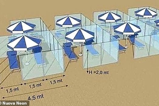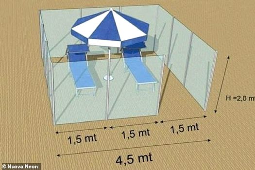 Compania italiană Nuova Neon Group 2 propune instalarea cabinelor de plajă. Ele ar putea fi făcute din plexiglass şi ar asigura aşa numita distanţare socială, spun designerii, care notează că în interiorul cabinelor ar încăpea două şezlonguri şi o umbrelă.