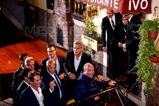 La rândul său, George Clooney a purtat la acest dineu de gală un costum bleumarin închis, la care a asortat o cămaşă albă descheiată. Din alaiul viitorului mire nu a lipsit actorul Matt Damon, care a venit la Veneţia însoţit de soţia lui, Luciana Barroso, şi Rande Gerber, soţul top modelului Cindy Crawford şi cel care va fi cavaler de onoare al lui Clooney.