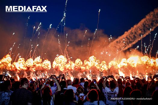 11. Persoane fotografiaza cu telefoanele mobile un show pirotehnic la finalul mitingului aviatic „Bucharest International Air Show” (B.I.A.S), desfasurat pe aeroportul Baneasa din Bucuresti, sambata, 24 august 2019. ANDREEA ALEXANDRU / MEDIAFAX FOTO