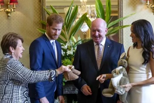 Şi chiar în prima zi a vizitei în Australia, prinţul Harry a primit primul cadou oficial pentru viitorul bebeluş, o pereche de cizmuliţe Ugg şi un cangur din pluş, dăruite în Sydney, de guvernatorul general Peter Cosgrove.