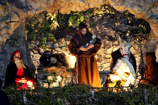 Potrivit lui Ion Ghinoiu, autorul volumului „Zile şi mituri. Calendarul ţăranului român”, legendele Naşterii ne invită în peisajul etnografic al unui sat pastoral, unde trăiau Moş Ajun şi Moş Crăciun, care avea case mari şi multe grajduri. Pe neaşteptate, în viaţa lor apare o femeie necunoscută care, simţind că i-a venit vremea să nască, le cere ajutorul. Dacă primul o refuză, cel de-al doilea îi întinde o mână. Neştiind însă că femeia este Maica Domnului, nu o primeşte în casă şi o trimite să nască în grajdul vitelor. Crăciuneasa o ajută să nască, fără ştirea soţului ei, dar este pedepsită apoi de el cu tăierea mâinilor din coate. Când Crăciun află că în grajdul său s-a născut Domnul Iisus, se căieşte şi îi cere iertare lui Dumnezeu, devenind „primul creştin”, „Sfântul cel mai bătrân”, „soţul femeii care a moşit-o pe Maria”. Se spune că el s-a căit atât de mult, încât a doua zi şi-a împărţit întreaga avere copiilor săraci, de unde tradiţia de a face daruri de Crăciun, mai ales copiilor.