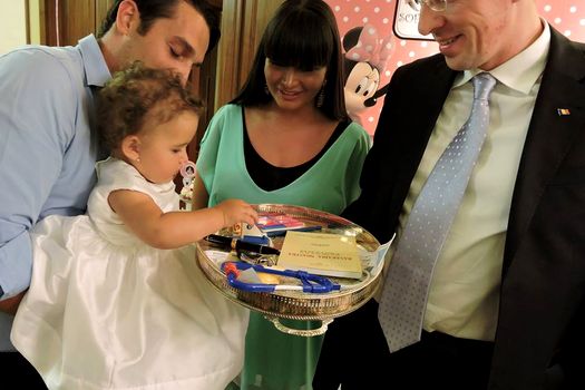 Tot potrivit obiceiurilor româneşti, pe o tavă au fost puse mai multe obiecte din care să aleagă fetiţa şi care ar indica ceea ce va face în viaţă. Pe tavă sunt, printre altele, cartea ”Basarabia noastră” a lui Nicolae Iorga, un stilou, o pensulă, cheile unui autoturism, bani, un stetoscop de jucărie şi o bărcuţă.