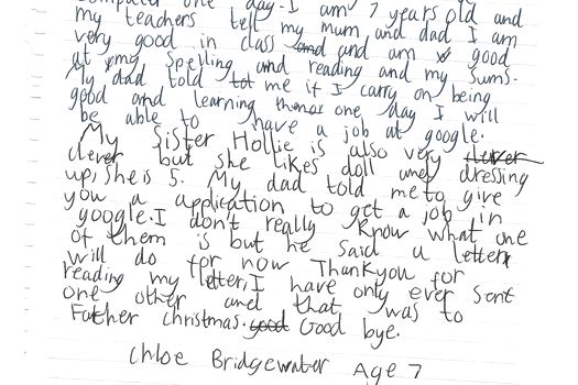 Chloe, care locuieşte în Hereford, Anglia, a fost inspirată să compună scrisoarea după ce a văzut în imagini birourile de la Google, unde angajaţii beneficiează de scaune comode, karturi şi tobogane.