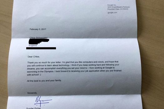 Cei doi au primit înapoi o scrisoare de la CEO-ul companiei, Sundar Pihchai, care a încurajat-o pe Chloe să nu renunţe la visurile ei şi o aşteaptă să aplice pentru job la finalul şcolii.