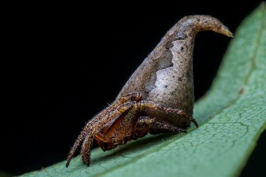 Oricât de interesant ar fi numele speciei de păianjen, trăsăturile fizice şi comportamanetale ale acesteia sunt uimitoare. Membrii genului ”sunt caracterizaţi prin prezenţa unei carapace păroase, a unui abdomen sub-triunghiular şi a unui posterior îngust, cu sau fără un apendice caudal”, cu alte cuvinte o carapace aproape triunghiulară acoperită de peri moi, care se poate termina sau nu într-o coadă. Aceşti păianjeni nocturni „se refugiază şi imită frunzele uscate în timpul zilei”, cel mai probabil pentru a se proteja de prădători.