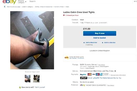 „Dresuri purtate de stewardese în zboruri internaţionale. Mărimea medie şi purtate de o doamnă înaltă. Poti fi trimise spălate sau nu”, este unul dintre anunţuri. Una dintre femeile care îşi vinde pantofii pe eBay susţine că după ce a postat anunţul a fost asaltată cu mesaje de la potenţiali clienţi. Majoritatea întreabă ce miros au pantofii.