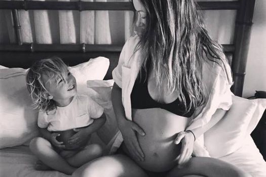 Olivia a postat o fotografie alb-negru pe reţeaua de socializare, în care stă în pat alături de fiul său, amândoi cu burtica la vedere, despre care a scris: „Matching baby bumps”.