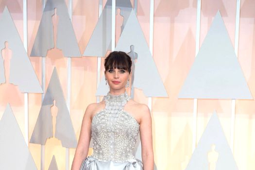 Felicity Jones, nominalizată la premiul Oscar pentru cea mai bună actriţă în rol principal, pentru prestaţia din „Teoria Întregului/ The Theory of Everything”, a purtat o rochie gri, creaţie semnată Alexander McQueen, inspirată parcă din basme, cu un top decorat cu mărgele, care acopereau inclusiv gâtul. Jones a declarat că a ales rochia pentru „puterea şi feminitatea” sa.