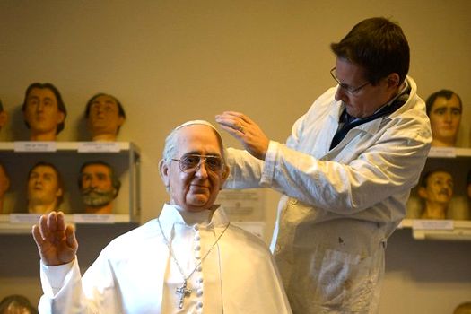 Mâinile şi capul statuii sunt fabricate dintr-un amestec de ceară şi silicon, utilizat în general de către stomatologi, în timp ce restul corpului – îmbrăcămintea albă papală – este din lemn şi răşină.