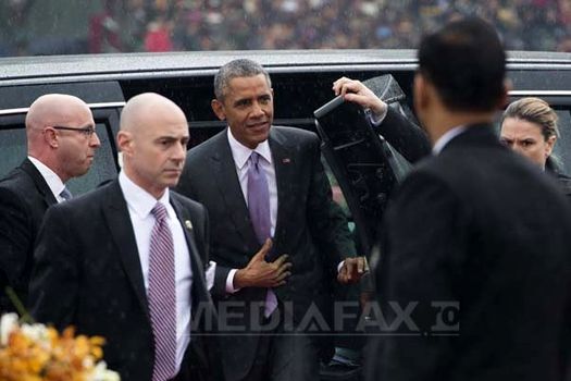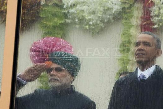 Obama a ajuns la locul paradei în limuzina sa blindată, cunoscută sub numele de Bestia, evitând, din motive de securitate, tradiţia de a fi transportat în vehiculul preşedintelui indian. A luat apoi loc între prim-ministrul indian Narendra Modi, alături de care a anunţat un progres în înţelegerea din domeniul nuclear civil, şi preşedintele indian Pranab Mukherjee (a cărui alegere de acoperământ al capului a cauzat un pic de controversă în social media).