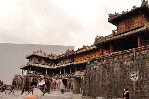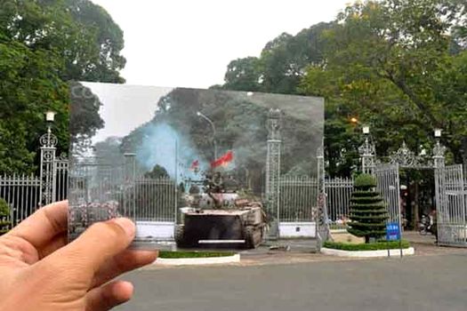 Una dintre fotografii prezintă câţiva soldaţi care cuceresc în mod triumfal un templu vietnamez care, în anul 2013, pare a fi o atracţie turistică locală.