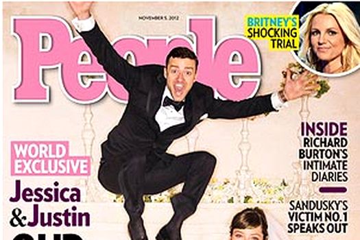Publicaţia a obţinut prima fotografie de nuntă a celor doi, în care mirele, Justin Timberlake, apare într-o postură foarte amuzantă. Jessica Biel, îmbrăcată în rochie de mireasă şi având un buchet de flori albe în mână zâmbeşte larg, în timp ce Timberlake face un salt în aer, momentul fiind imortalizat de fotograful oficial al ceremoniei.