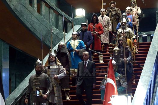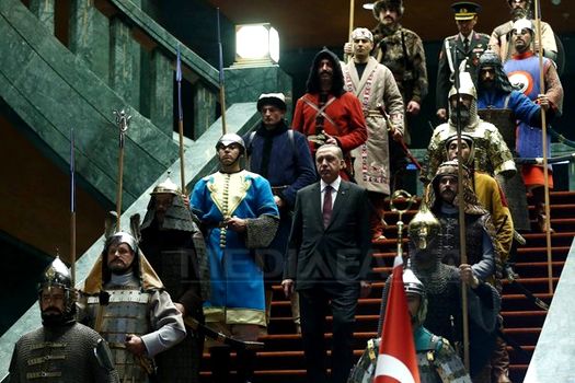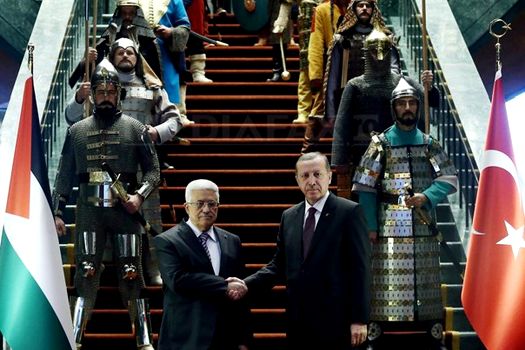 Erdogan l-a primit pe preşedintele Autorităţii Palestiniene, Mahmoud Abbas, flancat de 16 soldaţi în costume istorice de războinici, fiecare reprezentând câte unul din statele turce din trecut, notează Bloomberg. Soldaţii erau protejaţi de armuri şi aveau săbii şi lănci. Potrivit agenţiei de stat Anadolu, a fost pentru prima dată în istoria Turciei când este organizată o astfel de ceremonie oficială de primire.