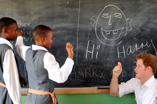 Totodată, prinţul britanic a luat parte la o oră de engleză, la debutul căreia a fost impresionat de primirea de care a avut parte, tinerii compunând un mesaj mare de bun venit, însoţit de declaraţia „Te iubim prinţule Harry!”. Harry a învăţat câteva cuvinte în limbajul semnelor, de la o fetiţă de 14 ani, precum familie, tată, mamă, soră sau copil. Prinţul a fost plăcut impresionat să constate că după o lecţie de doar câteva minute a reuşit să compună propoziţia „Numele meu este Harry”.