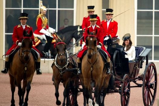 Pentru prima dată prinţul William a participat la parada gărzilor reginei, defilând călare în aceeaşi urniformă a Gărzii Irlandeze pe care a purtat-o şi în ziua nunţii, completată de această dată cu tradiţionala cuşmă neagră înaltă din blană de urs.